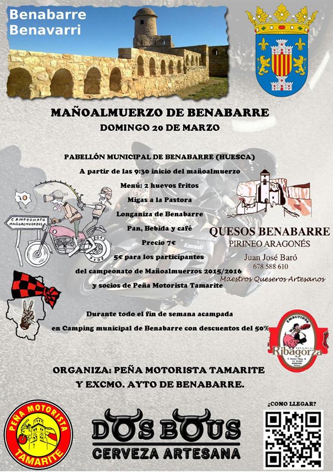 MAÑOALMUERZO BENABARRE 2016 Posted on marzo 17, 2016 by Turismo Benabarre Benavarri Este domingo 20 de marzo Benabarre acoge el Mañoalmuerzo anual organizado por la Peña Motera de Tamrarite. Este es el cartel del evento: Comparte esta info en tus redes socialesFacebookTwitter