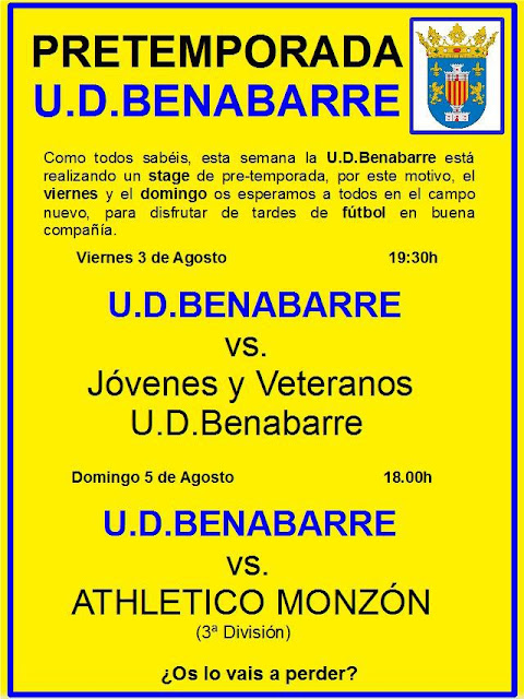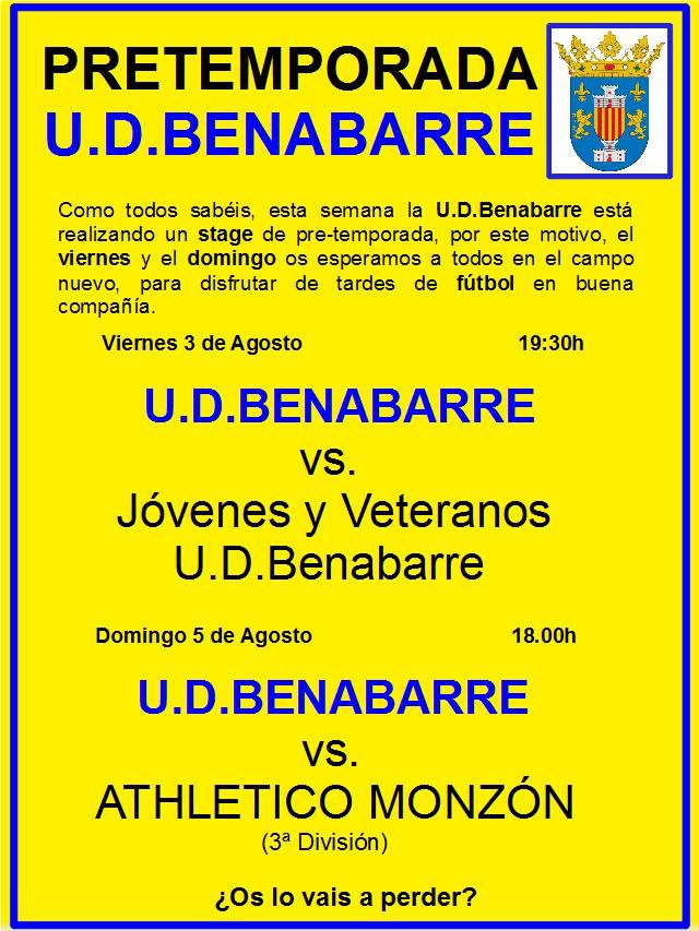 PARTIDOS DE PRE-TEMPORADA U.D. BENABARRE Posted on agosto 1, 2012 by Turismo Benabarre Benavarri Estos son los dos partidos que la U.D. Benabarre va a celebrar dentro del stage de pre-temporada que está realizando estos días. Comparte esta info en tus redes socialesFacebookTwitter
