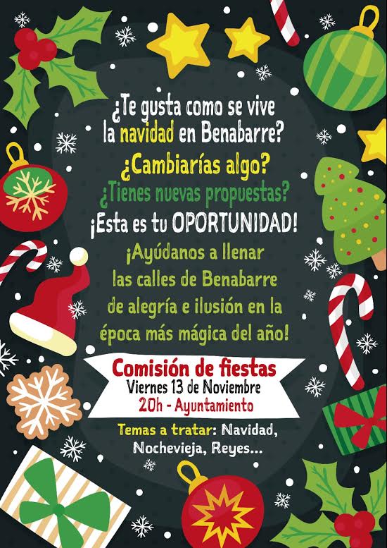 REUNIóN COMISIóN DE FIESTAS Posted on noviembre 6, 2015 by Turismo Benabarre Benavarri El próximo viernes día 13 habrá reunión de la comisión de fiestas para tratar los temas relacionados con la celebración de la Navidad.Tu opinión es importante. Comparte esta info en tus redes socialesFacebookTwitter