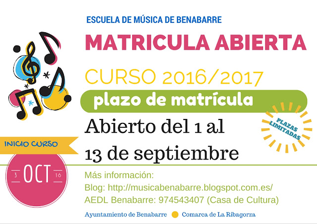 Ya está abierto el plazo de matrícula de la escuela de música de Benabarre, curso 2014/2015. También de la Escuela de música tradicional. El Plazo de inscripciones es hasta el 12 de septiembre.