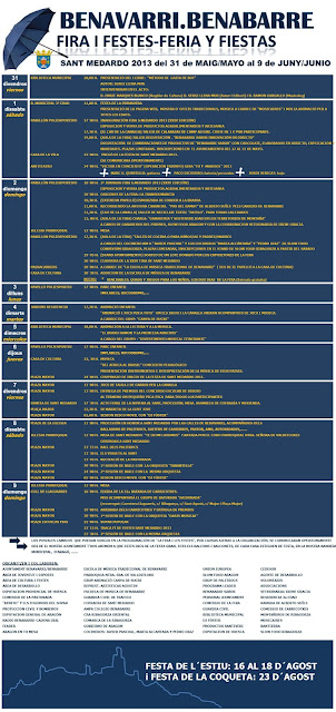 Plaza dela iglesia a las 11 horas: PROCESIÓN EN HONOR A SANT MEDARDO POR LAS CALLES DE BENABARRE, ACOMPAÑADOS DEL BALL DE PALLITROCS, GAITERS DE CASSERRES, PASTOR, AMO, AUTORIDADES…