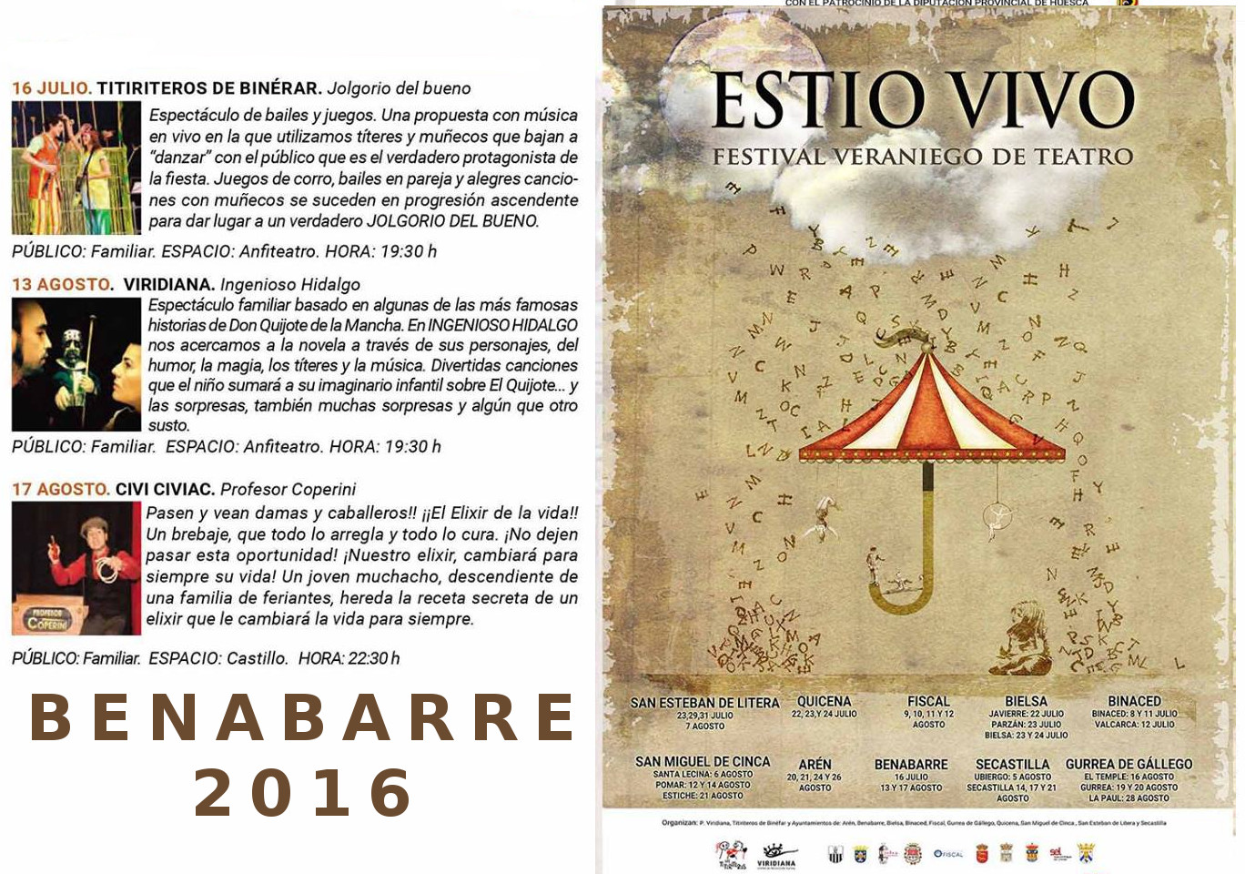 ESTIO VIVO 2016 Posted on julio 8, 2016 by Turismo Benabarre Benavarri Hoy se ha presentado el programa de Estio Vivo, el festival de teatro itinerante de la Provincia de Huesca.Estas son las actuaciones programadas en Benabarre: Click para ampliar Comparte esta info en tus redes socialesFacebookTwitter